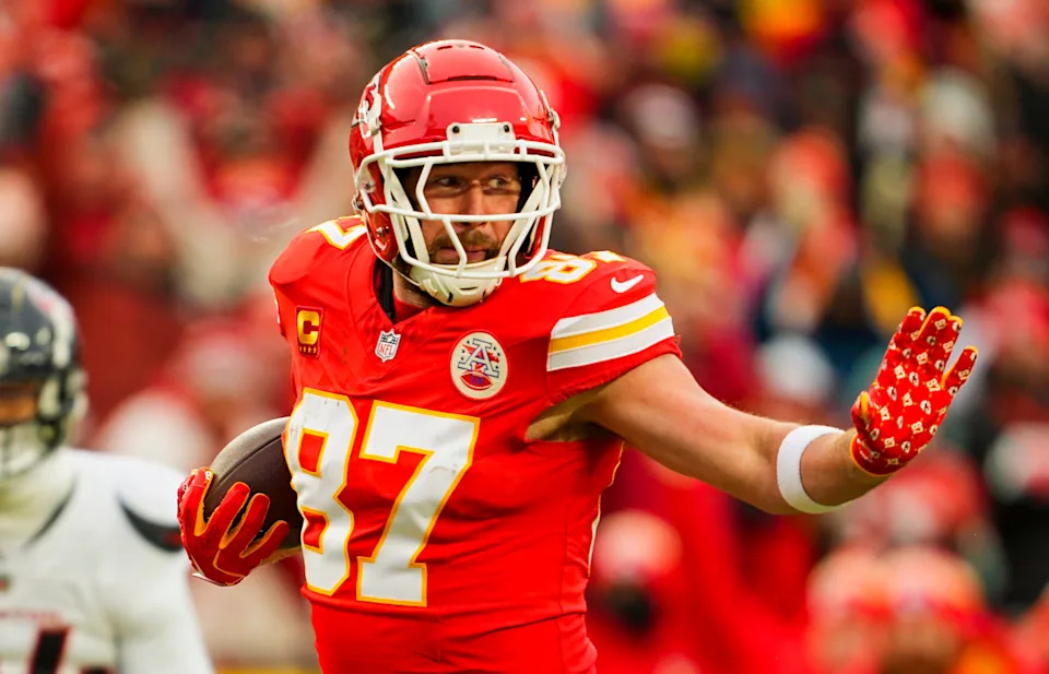 Kansas City Chiefs tight end Travis Kelce (87) runs with the ball during the first half against Houston Texans during a 2025 AFC divisional round game at GEHA Field at Arrowhead Stadium in Kansas City, Missouri on Jan. 18, 2025.