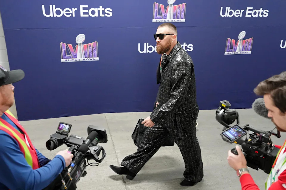 Feb. 11, 2024: Travis Kelce arrives before Super Bowl 58 against the San Francisco 49ers at Allegiant Stadium.