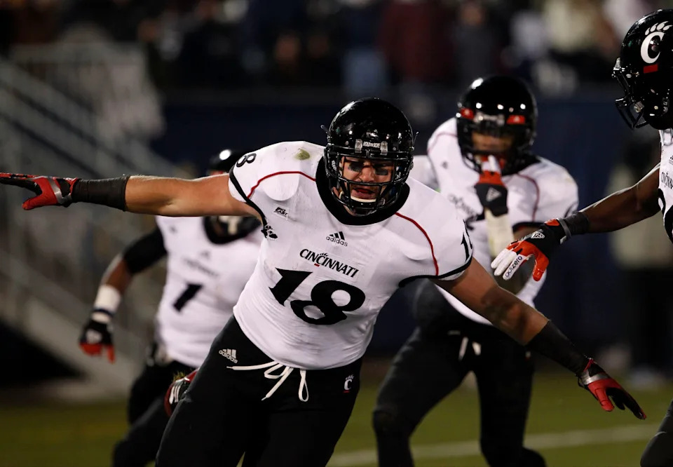 Dec. 1, 2012: Cincinnati tight end Travis Kelce celebrates his touchdown against Connecticut at Rentschler Field.