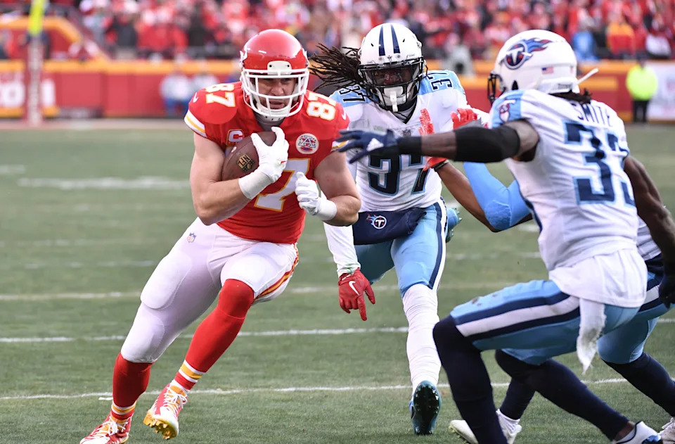 Jan. 6, 2018: Travis Kelce is tackled by Tennessee Titans cornerback Tye Smith (33) during the first quarter of the AFC wild-card playoff game at Arrowhead Stadium. The Titans won the game, 22-21.