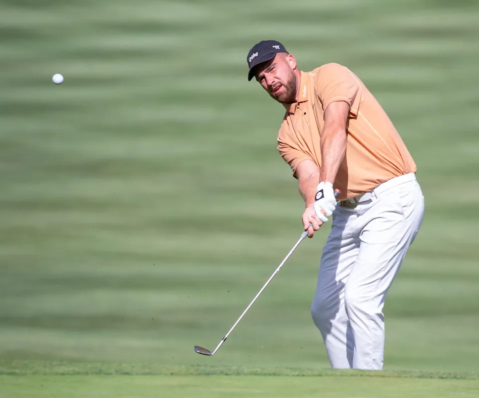 July 16, 2023: Travis Kelce hits an approach shot during the final round of the American Century Celebrity Championship golf tournament at Edgewood Tahoe Golf Course in Stateline, Nevada.