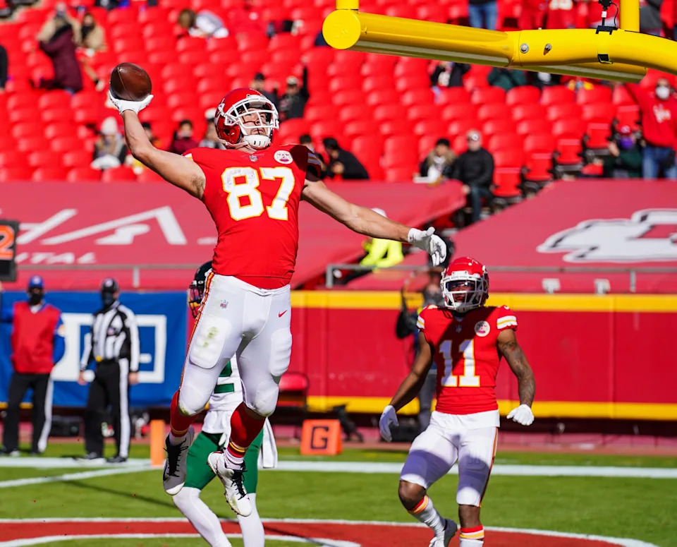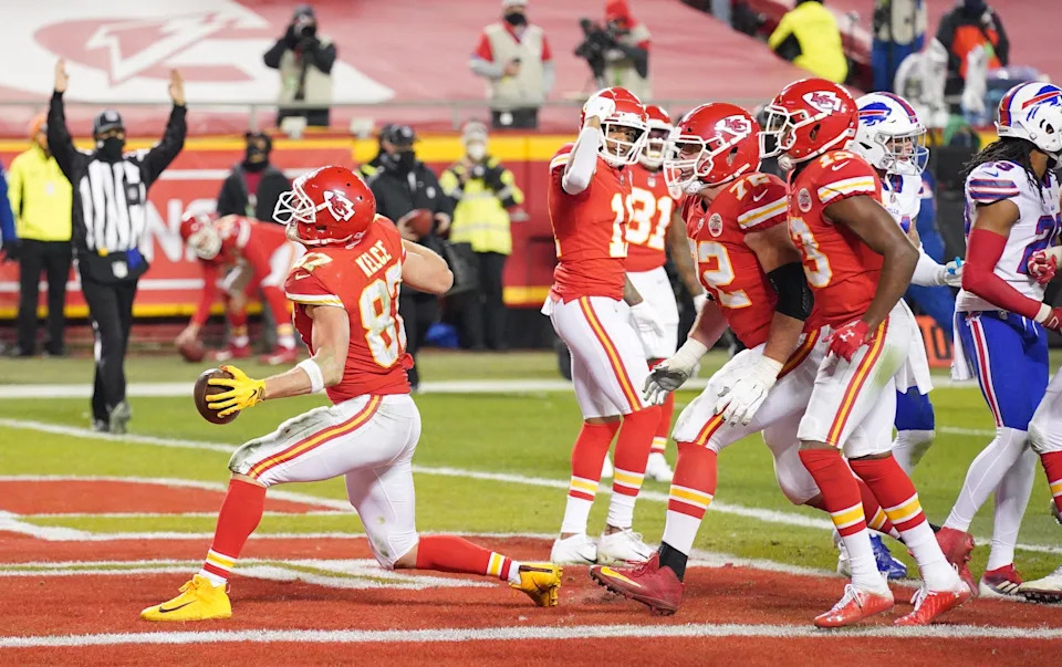 Jan. 24, 2021: Travis Kelce celebrates after scoring a touchdown against the Buffalo Bills during the Kansas City Chiefs’ win in the AFC championship game at Arrowhead Stadium.