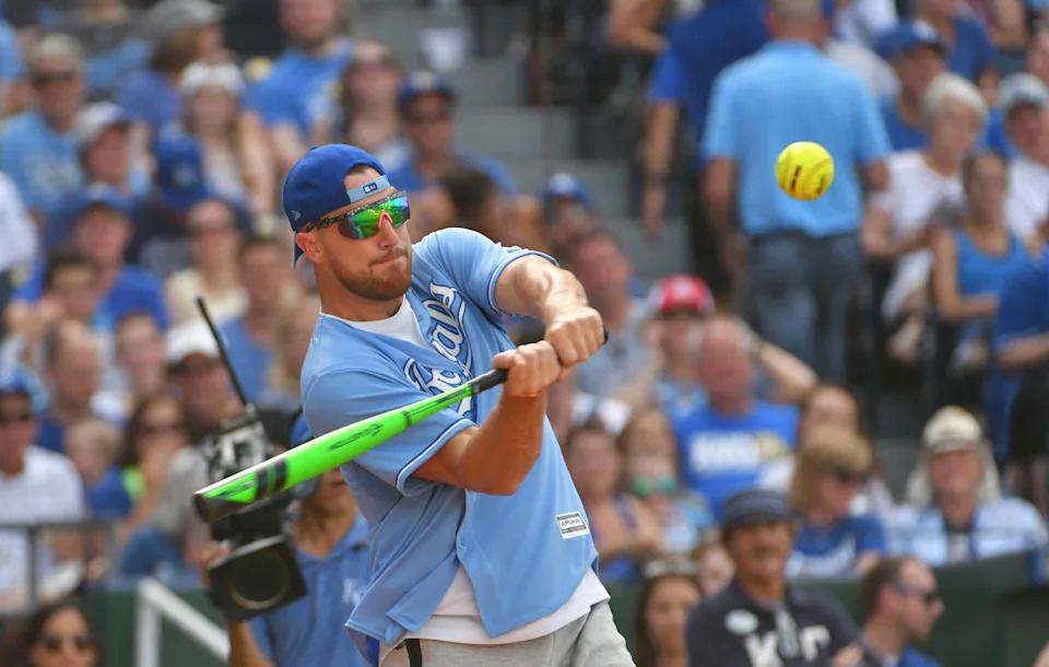 June 17, 2016: Travis Kelce takes a swing during the Big Slick Celebrity Softball game at Kauffman Stadium.