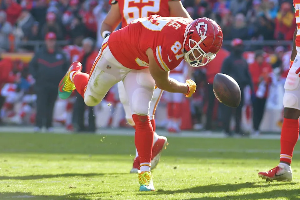 Dec. 14, 2025: Kansas City Chiefs tight end Travis Kelce reacts after catching a pas against the Los Angeles Chargers at GEHA Field at Arrowhead Stadium. The Chiefs lost the game, 16-13, and were eliminated from playoff contention, ending a 10-season postseason streak.