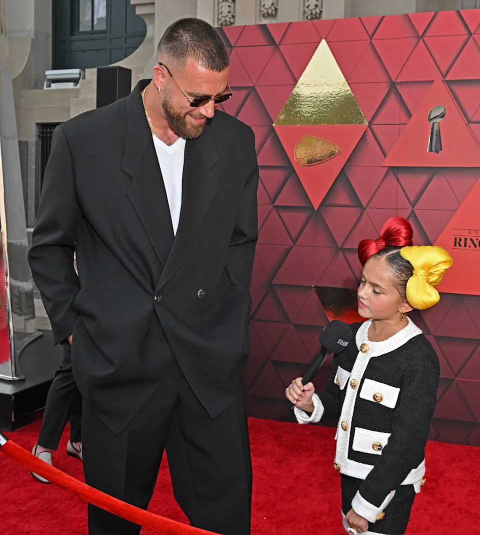 June 15, 2023: Travis Kelce is interviewed by Taylen Biggs during the Kansas City Chiefs Super Bowl Red Carpet Ceremony at Union Station in Kansas City.