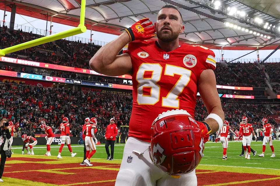 Nov. 5, 2023: Travis Kelce reacts to fans before an NFL International Series game against the Miami Dolphins at Deutsche Bank Park in Frankfurt, Germany. The Chiefs won the game, 21-14.