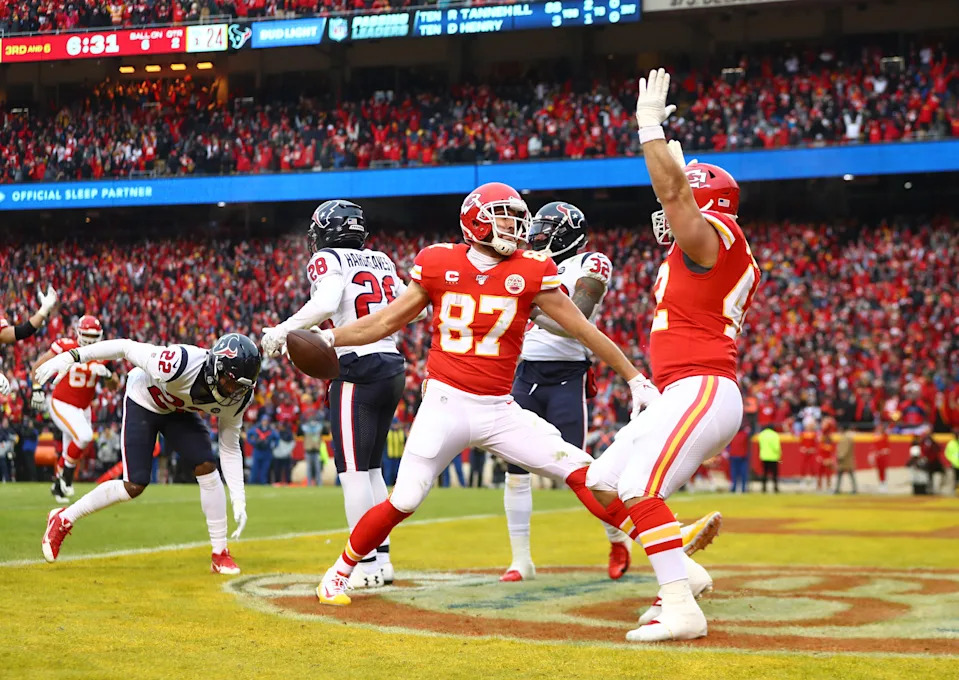 Jan. 12, 2020: Travis Kelce celebrates a touchdown catch during the Kansas City Chiefs’ win over the Houston Texans in the AFC divisional playoffs at Arrowhead Stadium.