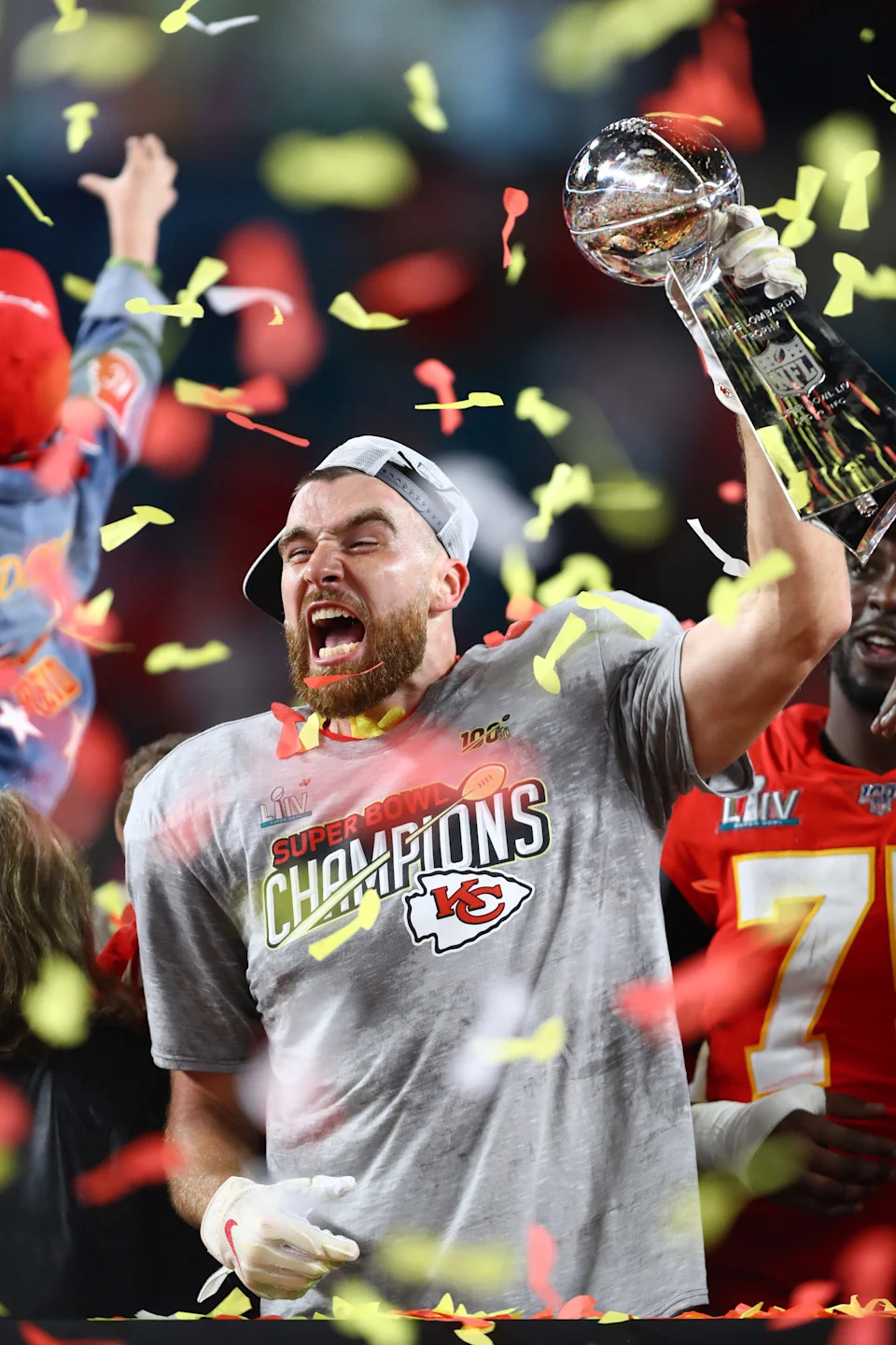 Feb. 2, 2020: Travis Kelce celebrates with the Lombardi Trophy after the Kansas City Chiefs’ win over the San Francisco 49ers in Super Bowl LIV at Hard Rock Stadium.