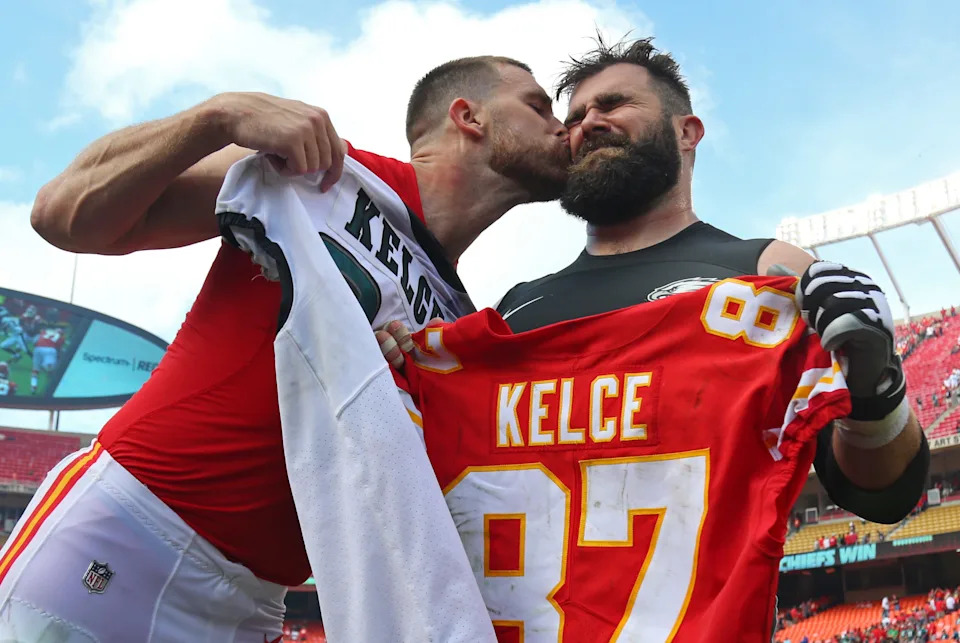 Sep. 17, 2017: Kansas City Chiefs tight end Travis Kelce kisses Jason Kelce after a game at Arrowhead Stadium.
