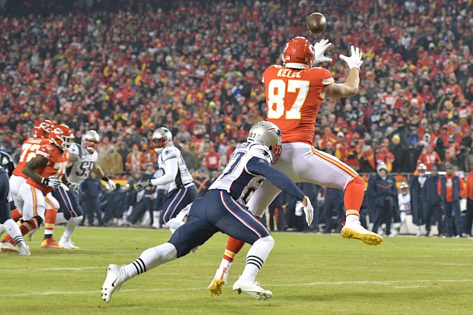 Jan. 20, 2019: Travis Kelce catches a touchdown pass in front of New England Patriots defensive back J.C. Jackson (27) during the AFC championship game at Arrowhead Stadium. The Patriots won the game, 37-31, in overtime.