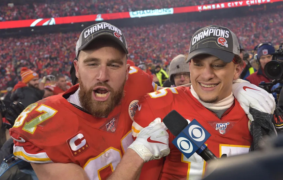 Jan. 19, 2020: Patrick Mahomes celebrates with Travis Kelce (87) after the Kansas City Chiefs’ win over the Tennessee Titans in the AFC championship game at Arrowhead Stadium.