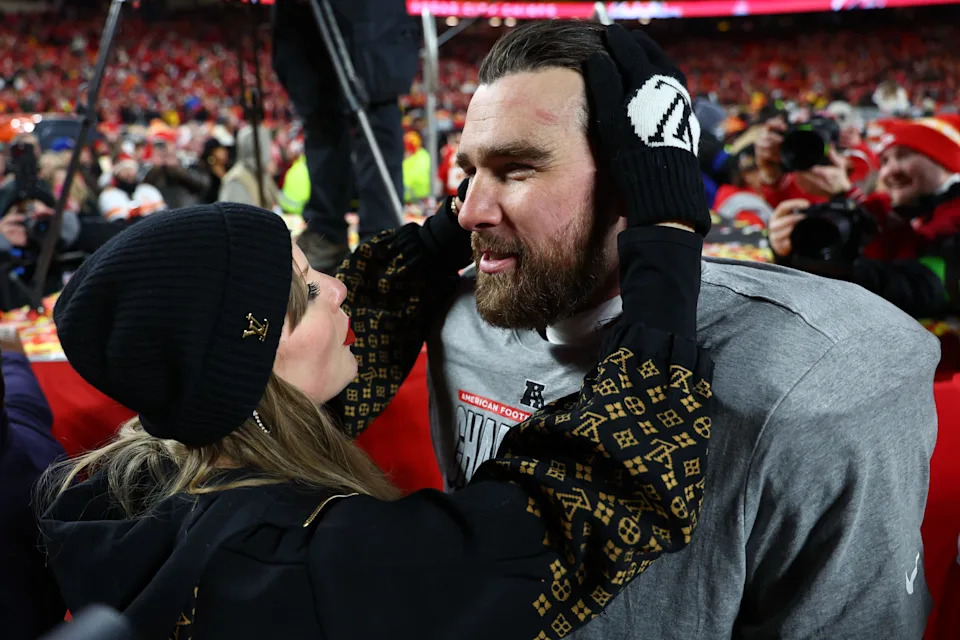 Jan. 26, 2025: Recording artist Taylor Swift and Kansas City Chiefs tight end Travis Kelce celebrate the Chiefs’ win in the AFC championship game against the Buffalo Bills at GEHA Field at Arrowhead Stadium in Kansas City, Missouri.
