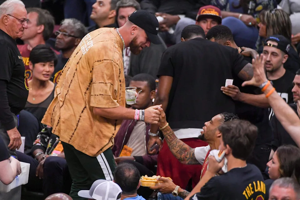 June 8, 2018: Travis Kelce (left) shakes hands with Pittsburgh Steelers cornerback Joe Haden (right) during the first quarter of Game 4 of the 2018 NBA Finals between the Golden State Warriors and Cleveland Cavaliers at Quicken Loans Arena. The Warriors defeated the Cavaliers, 108-85, to complete a four-game sweep.