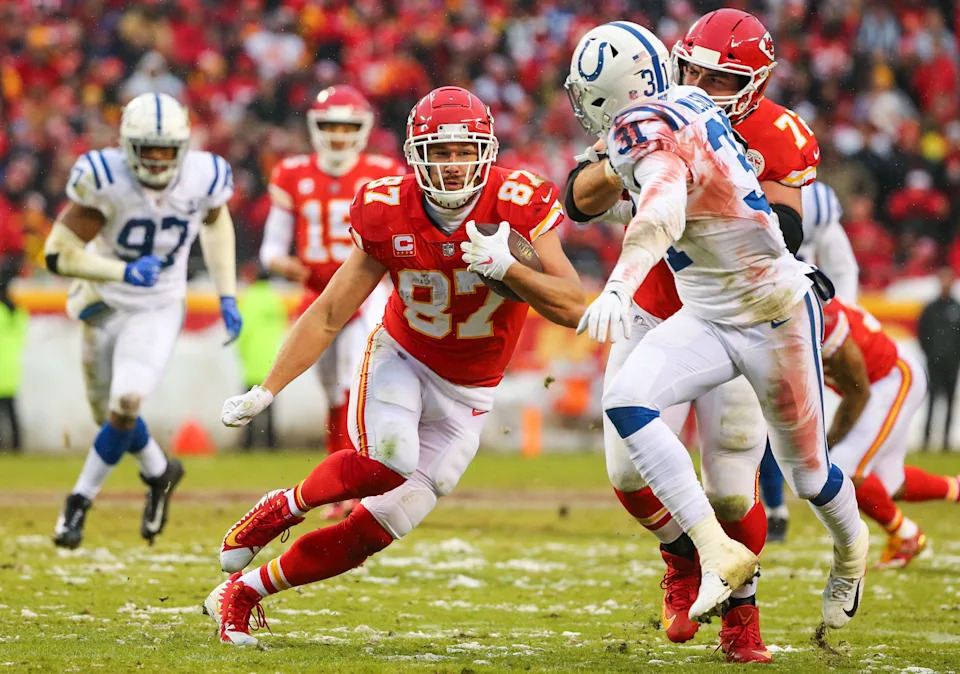 Jan. 12, 2019;: Travis Kelce runs the ball as offensive tackle Eric Fisher (72) blocks Indianapolis Colts cornerback Quincy Wilson (31) during the AFC divisional playoff game at Arrowhead Stadium. The Chiefs won the game, 31-13.