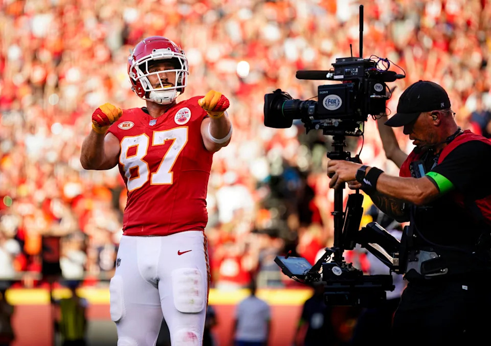 Sept. 24, 2023: Travis Kelce celebrates after scoring at touchdown against the Chicago Bears at Arrowhead Stadium.
