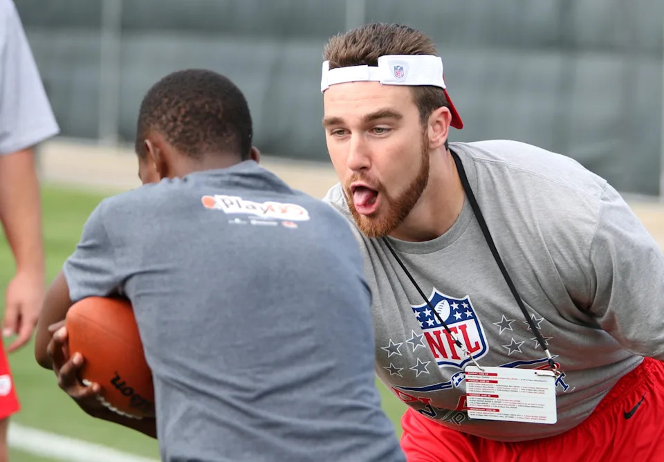 June 25, 2013: Travis Kelce works with kids during a NFL Play 60 event during the AFC Rookie Symposium at the Cleveland Browns Training Facility.