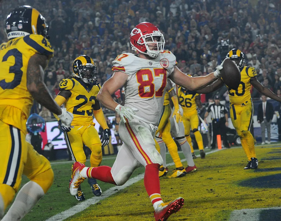 Nov. 19, 2018: Travis Kelce catches a touchdown pass from Patrick Mahomes against the Los Angeles Rams at the Los Angeles Memorial Coliseum. The Rams won the game, 54-51, in the highest-scoring “Monday Night Football” game ever played.