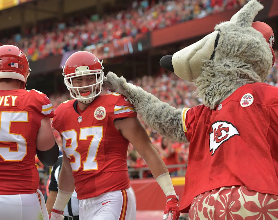 Sept. 25, 2016: Travis Kelce celebrates with Kansas City Chiefs mascot KC Wolf after scoring a touchdown against the New York Jets at Arrowhead Stadium.