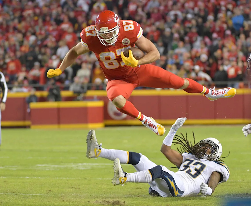 Dec. 16, 2017: Travis Kelce leaps over Los Angeles Chargers free safety Tre Boston (33) at Arrowhead Stadium.