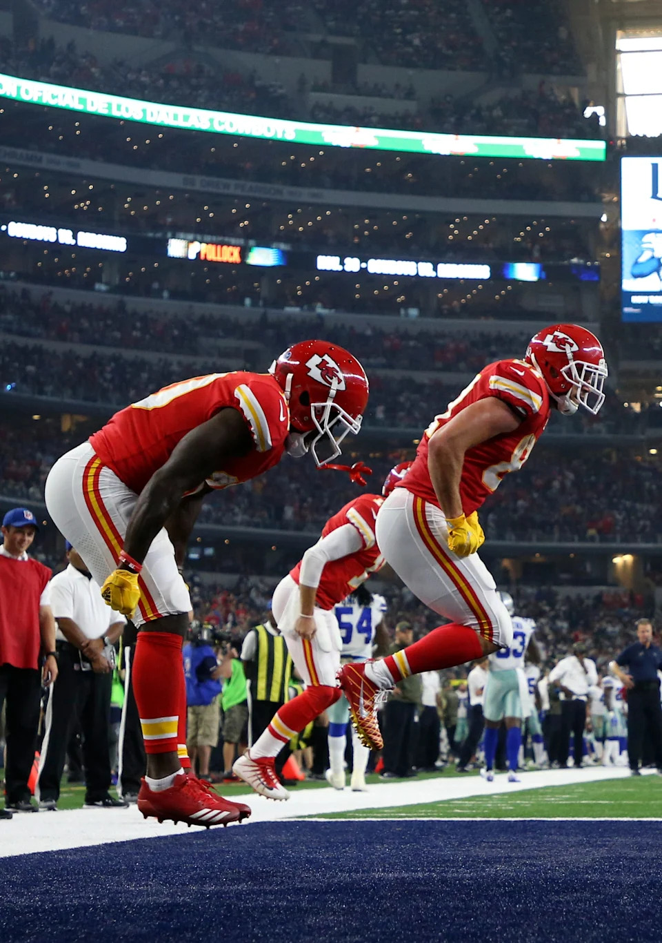 Nov. 5, 2017: Travis Kelce celebrates with teammates after scoring a touchdown against the Dallas Cowboys at AT&T Stadium.