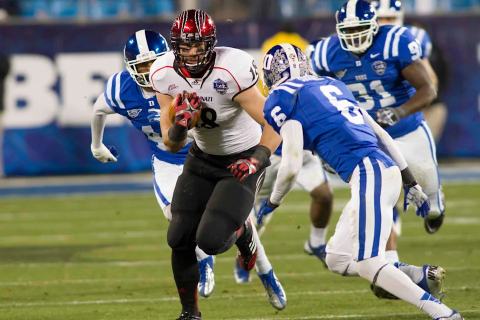 Dec. 27, 2012: Cincinnati tight end Travis Kelce runs after catching a pass against Duke in the Belk Bowl at Bank of America Stadium. Cincinnati won the Belk Bowl, 48-34.