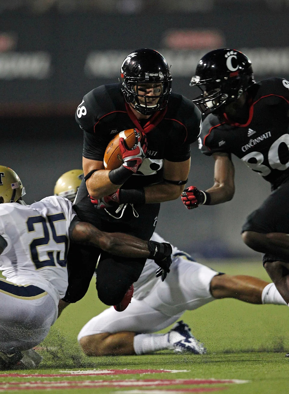 Sept. 6, 2012: Cincinnati tight end Travis Kelce (18) is brought down by Pittsburgh defensive back Jason Hendricks (25) during the first half at Nippert Stadium.