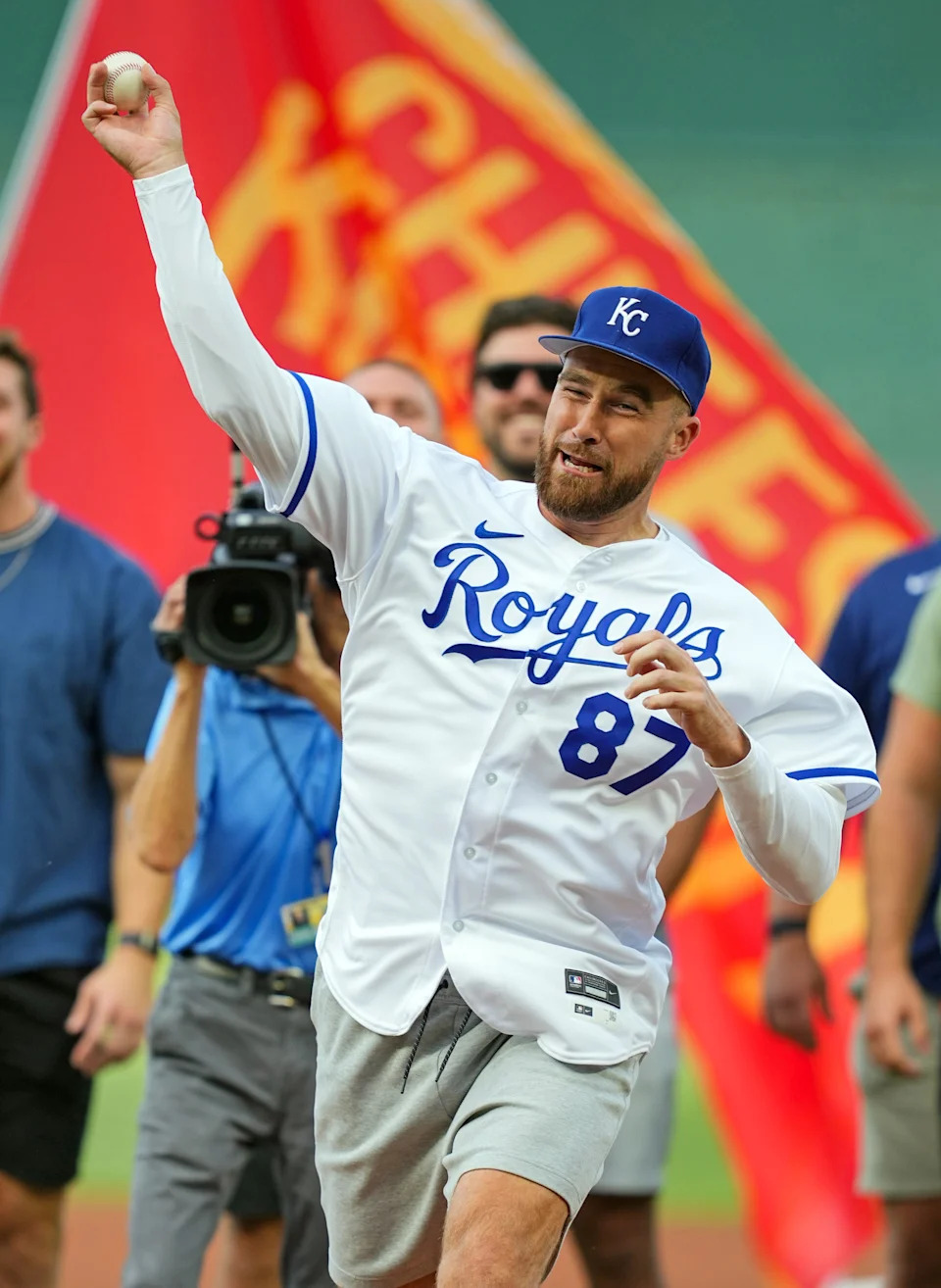 June 12, 2023: Travis Kelce throws out the first pitch prior to a game between the Cincinnati Reds and the Kansas City Royals at Kauffman Stadium.