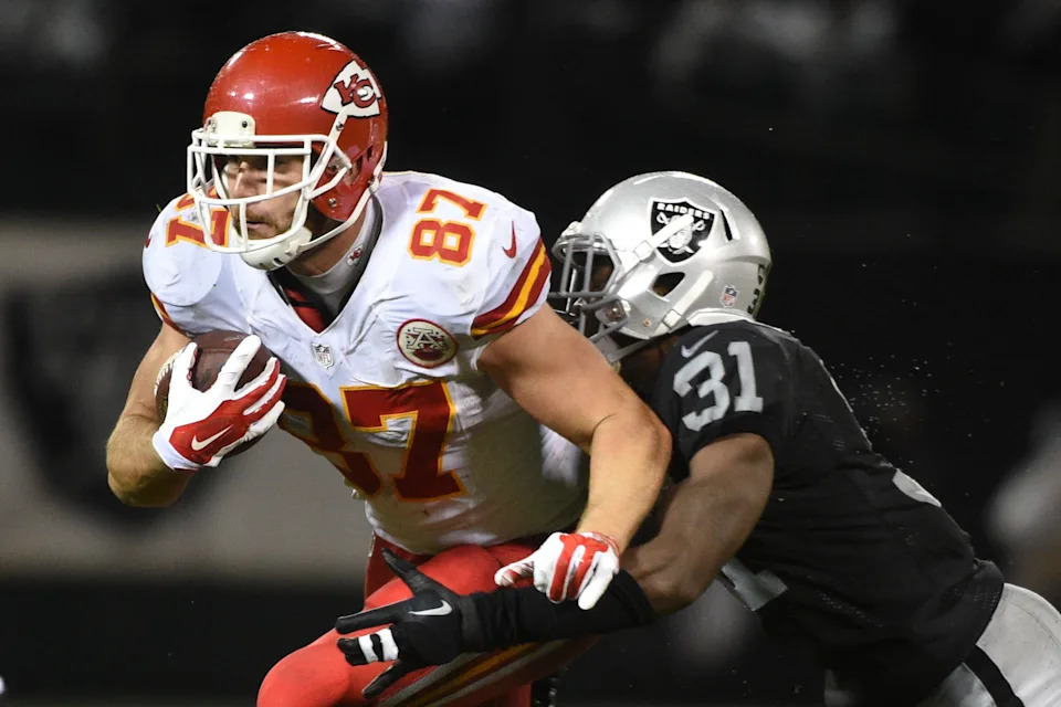 Nov. 20, 2014: Travis Kelce is tackled by Oakland Raiders defensive back Neiko Thorpe (31) during a 24-20 Kansas City Chiefs win at O.co Coliseum.