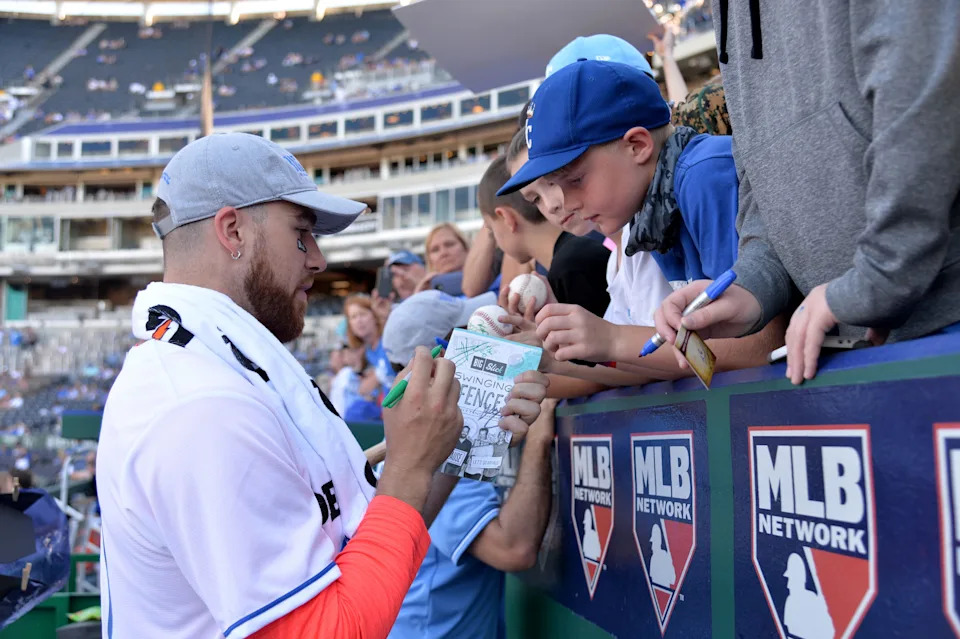 June 23, 2017: Travis Kelce signs autographs for fans during the Big Slick charity softball game before a Major League Baseball game between the Kansas City Royals and Toronto Blue Jays at Kauffman Stadium.