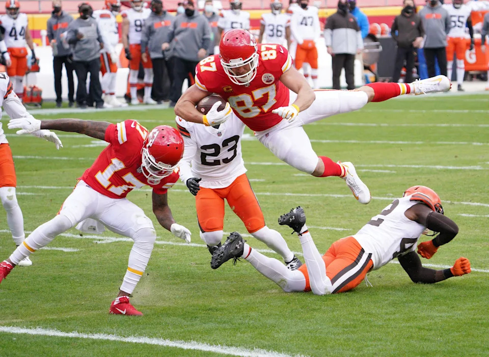 Jan. 17, 2021: Travis Kelce leaps over Cleveland Browns strong safety Karl Joseph (42) to score a touchdown in the Kansas City Chiefs’ win in the AFC divisional playoffs at Arrowhead Stadium.