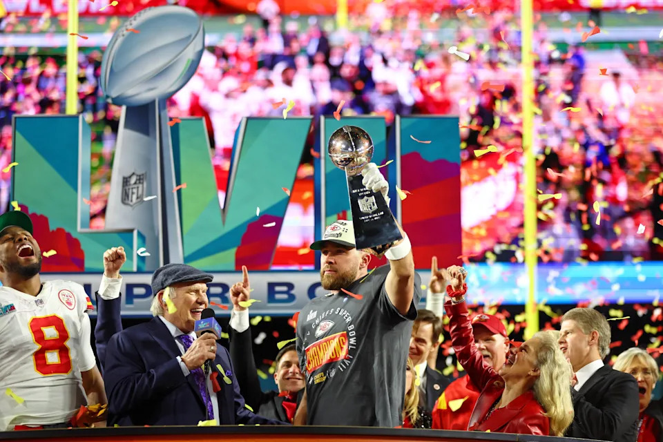Feb. 11, 2024: Kansas City Chiefs tight end Travis Kelce celebrates with the Vince Lombardi Trophy after his team’s win over the San Francisco 49ers in Super Bowl LVIII at Allegiant Stadium.