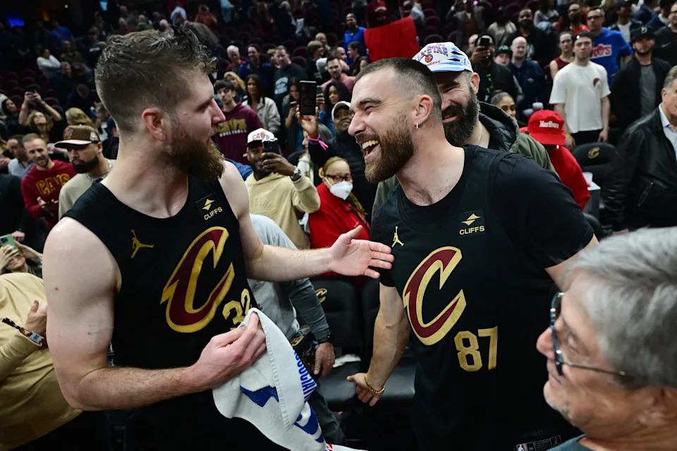 March 5, 2024: The Cleveland Cavaliers’ Dean Wade celebrates with Travis Kelce after the Cavaliers defeated the Boston Celtics at Rocket Mortgage FieldHouse.