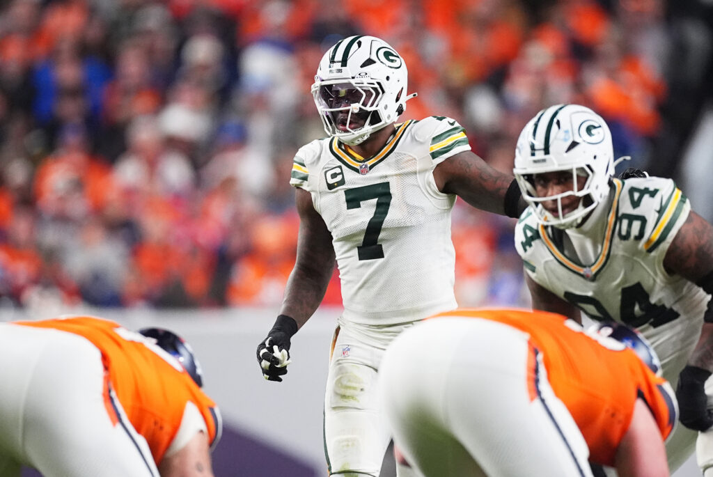 Green Bay Packers linebacker Quay Walker (7) in the second half of an NFL football game Sunday, Dec. 14, 2025, in Denver. (AP Photo/David Zalubowski)