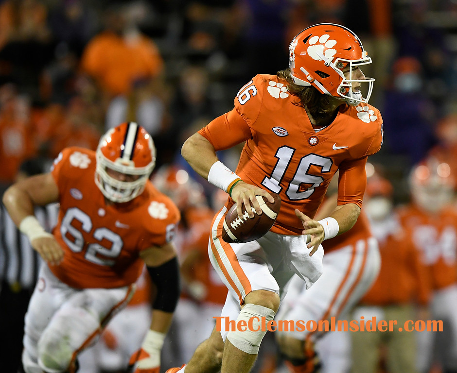 Clemson quarterback Trevor Lawrence rolls out of the pocket against Miami during the second quarter of Clemson’s game against Miami at Memorial Stadium in Clemson, S.C., on Saturday, Oct. 10, 2020. (Bart Boatwright/The Clemson Insider)
