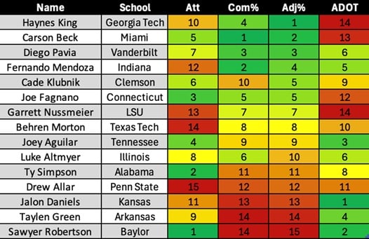You need additional context, though, such as the average depth of target (ADOT). Pairing a healthy ADOT with the initial accuracy metrics adds value. Meaning, a quarterback with a higher ADOT remained accurate even when pushing the ball downfield more. Looking at the top five names in completion rate, Mendoza had the healthiest 9.4 ADOT. Of the top three players in adjusted completion rates, Pavia had the strongest 9.3 ADOT.