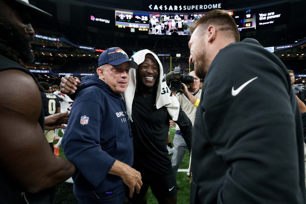 Aug 23, 2025; New Orleans, Louisiana, USA; Denver Broncos head coach Sean Payton greets New Orleans Saints running back Alvin Kamara, center, linebacker Demario Davis (56), left, and tight end Taysom Hill (7), right, at the end of the game at Caesars Superdome. Mandatory Credit: Matthew Hinton-Imagn Images