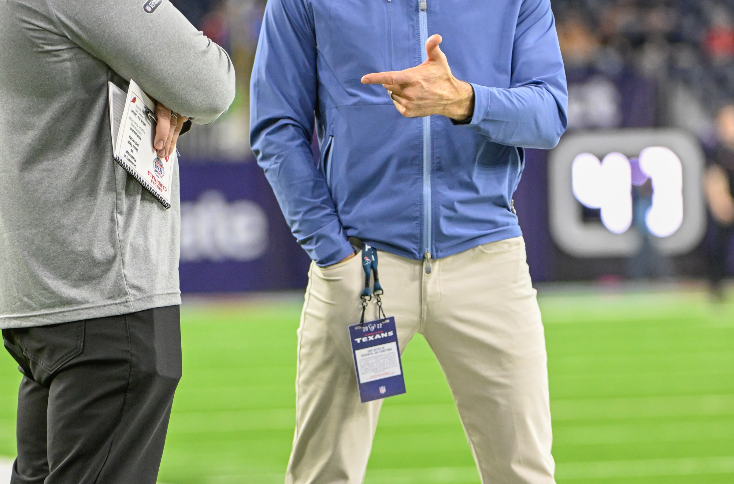 HOUSTON, TX – DECEMBER 28: Houston Texans General Manager Nick Caserio chats on the sideline before the TaxAct Texas Bowl between the Texas Tech Red Raiders and Ole Miss Rebels at NRG Stadium on December 28, 2022 in Houston, Texas. (Photo by Ken Murray/Icon Sportswire via Getty Images) Icon Sportswire via Getty Images