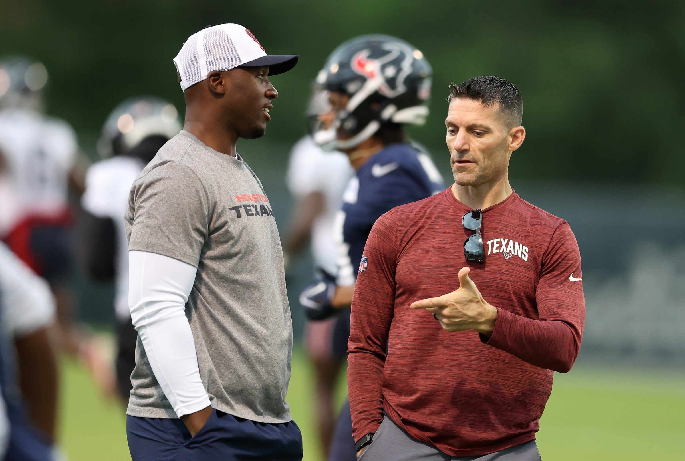 HOUSTON, TEXAS – JUNE 05: Head coach DeMeco Ryans of the Houston Texans talks with general manager Nick Caserio during mandatory minicamp at Houston Methodist Training Center on June 05, 2024 in Houston, Texas. (Photo by Tim Warner/Getty Images) Getty Images
