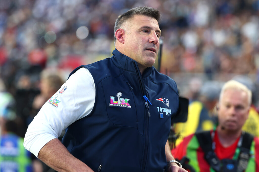 Feb 8, 2026; Santa Clara, CA, USA; New England Patriots head coach Mike Vrabel leaves the field at halftime against the Seattle Seahawks in Super Bowl LX at Levi’s Stadium. Mandatory Credit: Mark J. Rebilas-Imagn Images