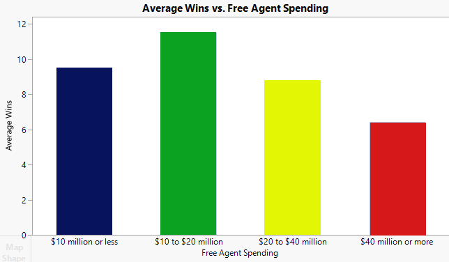 While this news seems unsettling on the surface, winning the headlines in March rarely translates into winning in the fall. Data shows a strong correlation between high free agent spending and fewer total wins over the long term. Breaking down average wins vs. average yearly free agent spending for the last seasons provides the following chart.