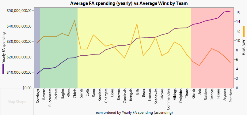 Breaking it out even further, let’s plot each NFL team in ascending order of free agent spending, as well as plotting their seasonal average win total.