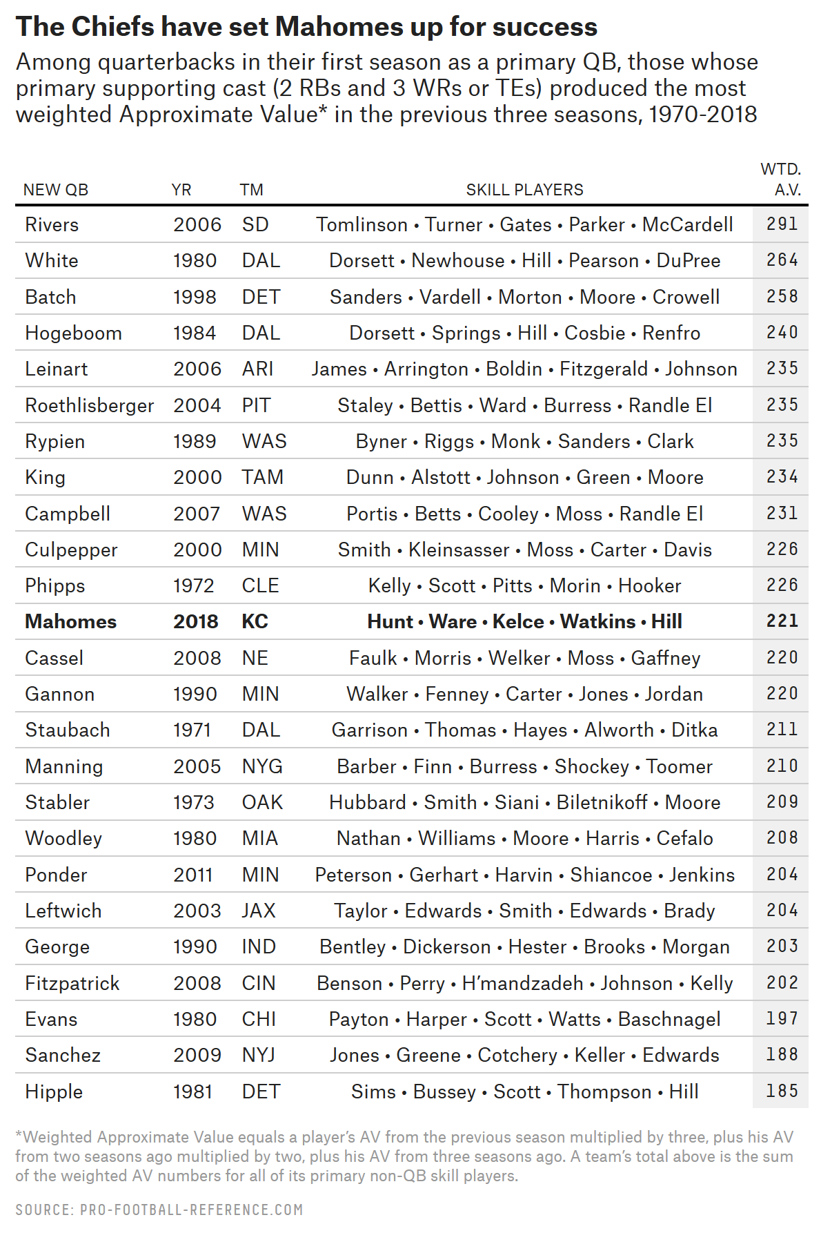 To measure this, I went back to the 1970 NFL-AFL merger and tracked each team’s top two running backs and top three receivers (whether wide receivers or tight ends) for each season using Pro-Football-Reference’s Approximate Value metric, which assigns each player a numerical value roughly corresponding to his statistical productivity that year. For those core groups of primary offensive skill players, I added up a weighted sum of their AV over the previous three seasons, to get a sense for how productive the group had been in the handful of seasons leading up to the one in question. Finally, I filtered for teams whose quarterback was in his first season as an NFL primary QB, to look for situations comparable to the one Mahomes currently finds himself in.