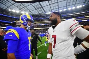 Jan 4, 2026; Inglewood, California, USA; Los Angeles Rams quarterback Jimmy Garoppolo (11) and Arizona Cardinals quarterback Jacoby Brissett (7) talk following a game at SoFi Stadium. Mandatory Credit: Gary A. Vasquez-Imagn Images
