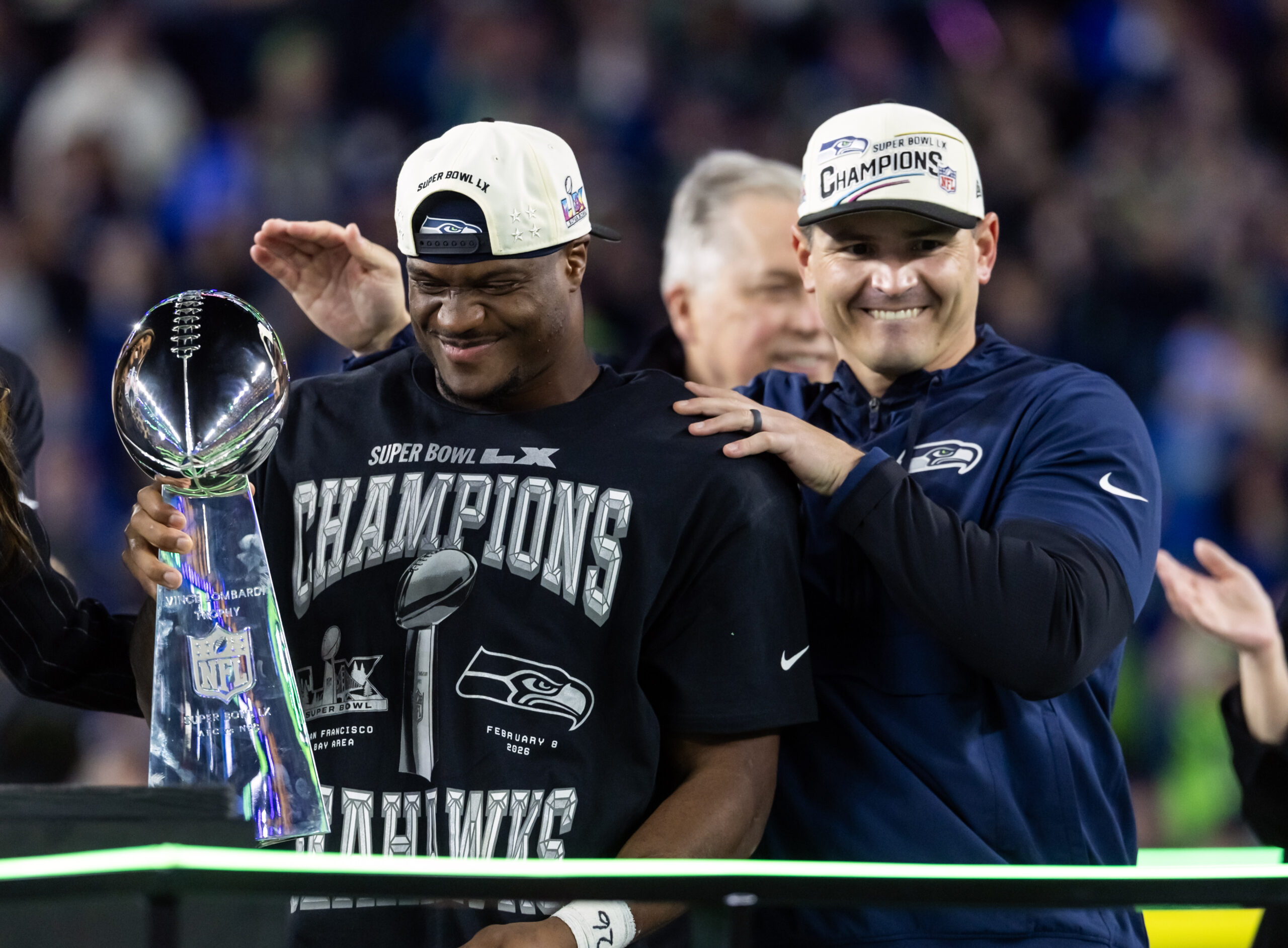 Feb 8, 2026; Santa Clara, CA, USA; Seattle Seahawks head coach Mike MacDonald and running back Kenneth Walker III (9) celebrate with the Vince Lombardi trophy after defeating the New England Patriots in Super Bowl LX at Levi’s Stadium. Mandatory Credit: Mark J. Rebilas-Imagn Images