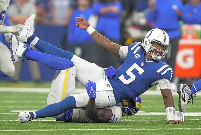Oct 1, 2023; Indianapolis, Indiana, USA; Los Angeles Rams linebacker Byron Young (0) tackles Indianapolis Colts quarterback Anthony Richardson (5) as he gets rid of the ball during the second half of the game at Lucas Oil Stadium. Mandatory Credit: Jenna Watson-Imagn Images
