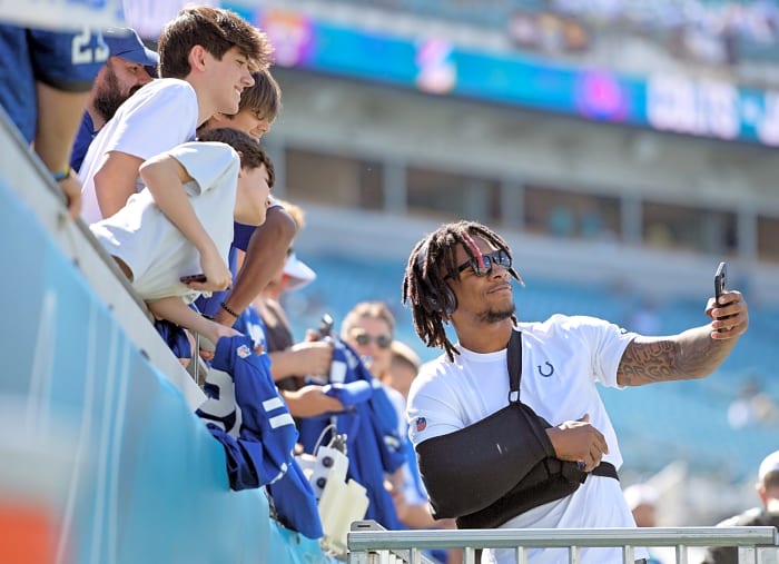 Oct 15, 2023; Jacksonville, Florida, USA; Indianapolis Colts quarterback Anthony Richardson (5) smiles and takes photos with fans before the game against the Jacksonville Jaguars at EverBank Stadium. Mandatory Credit: Melina Myers-Imagn Images