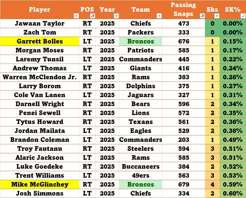 The only two starting OTs who had a lower sack percentage than Bolles were right tackles. Below are all the starting tackles who allowed lower than 0.6% sack rate in 2025. Mike McGlinchey also is on the list. Other teams with two tackles were the Chiefs, Rams, Commanders, Jags, Eagles and 49ers.