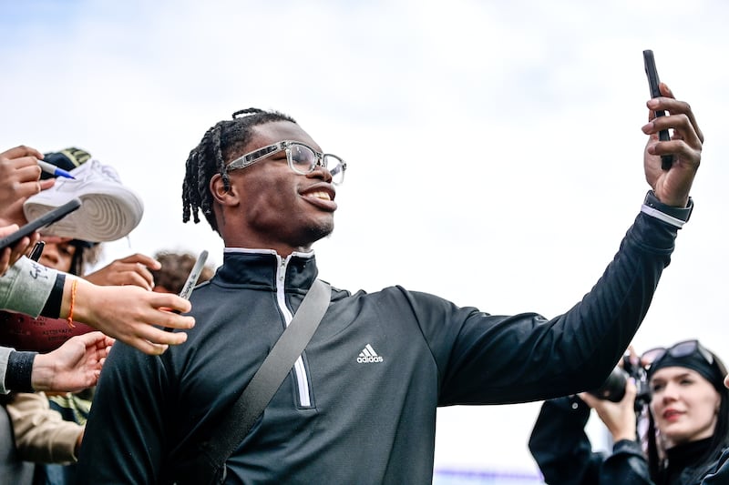 Colorado Black & Gold Spring Game BOULDER, CO – APRIL 19: Former Colorado Buffaloes player Travis Hunter takes a selfie with fans after the Black and Gold Spring Game at Folsom Field on April 19, 2025 in Boulder, Colorado. (Photo by Dustin Bradford/Getty Images for ONIT) (Dustin Bradford/Getty Images for ONIT)