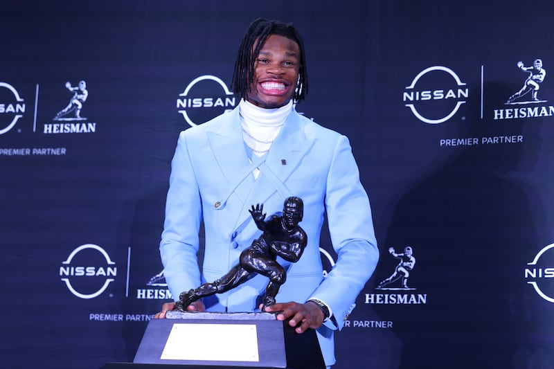 COLLEGE FOOTBALL: DEC 14 Heisman Trophy Ceremony NEW YORK, NY – DECEMBER 14: Travis Hunter University of Colorado cornerback/wide receiver poses with the Trophy during the Heisman Trophy press conference at the Marriott Marquis on December 14, 2024 in New York, New York. (Photo by Rich Graessle/Icon Sportswire via Getty Images) (Icon Sportswire/Icon Sportswire via Getty Images)