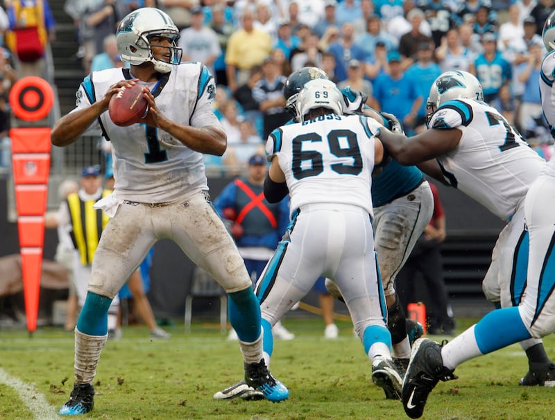 Carolina Panthers’ Cam Newton (1) looks for a receiver as his linemen, Jordan Gross (69) and Travelle Wharton (70) block the Jacksonville Jaguars’ defense during a game in Charlotte, N.C., Sunday, Sept. 25, 2011. | ASSOCIATED PRESS